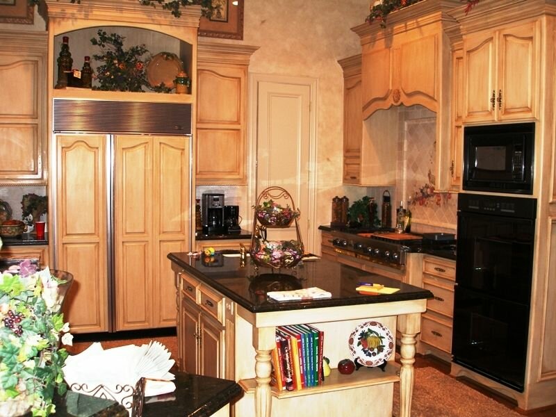 Чтобы мебель выглядела не новой, а старинной, ее поверхность специально состаривают – наносят древоточины, потертости и сколы. По традиции при оформлении фасадов используется мореное в темные тона дерево. Французские открытые полки с большими шкафами, в буфете – непременном элементе дизайна – выставляют нарядную посуду.