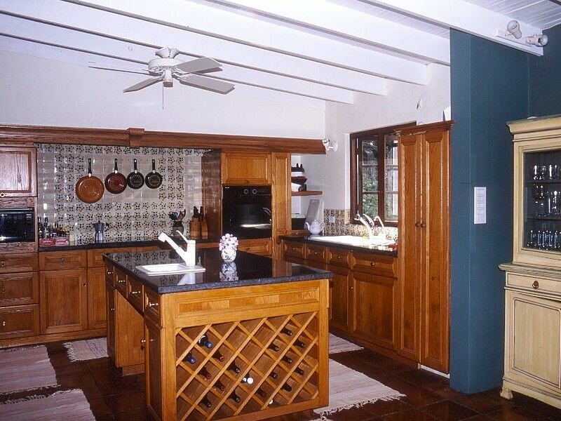 В кухнях такого стиля непременным элементом является медная кухонная посуда – чайник, кастрюли, сковородки. В застекленном буфете должен стоять китайский сервиз. Не лишними будут открытые полочки для экзотических колониальных сувениров. Подобных аксессуаров должно быт много, но все они должны быть настоящими – никаких дешевых подделок.