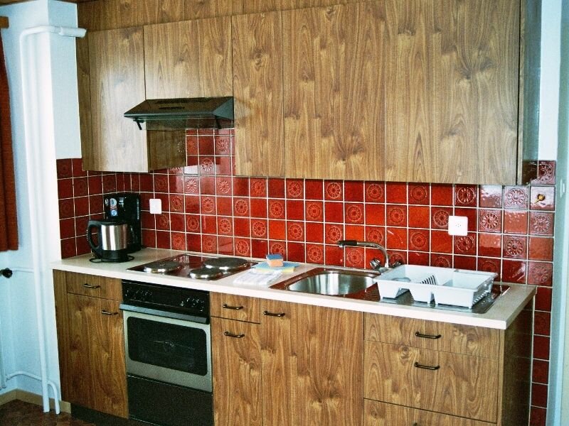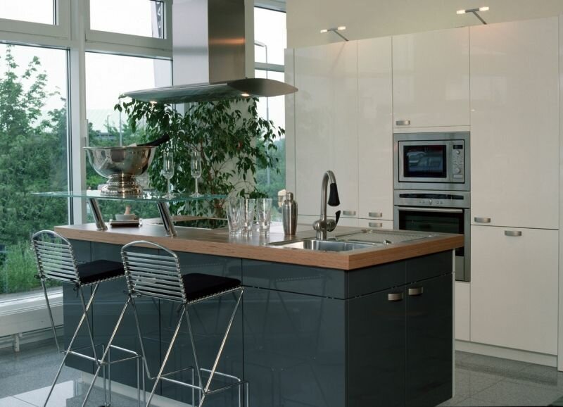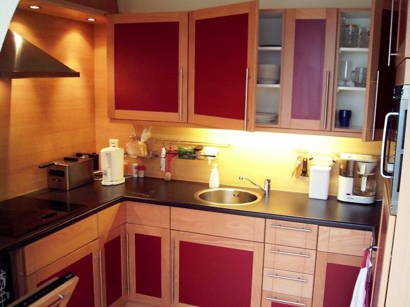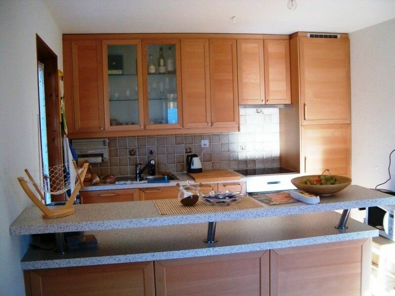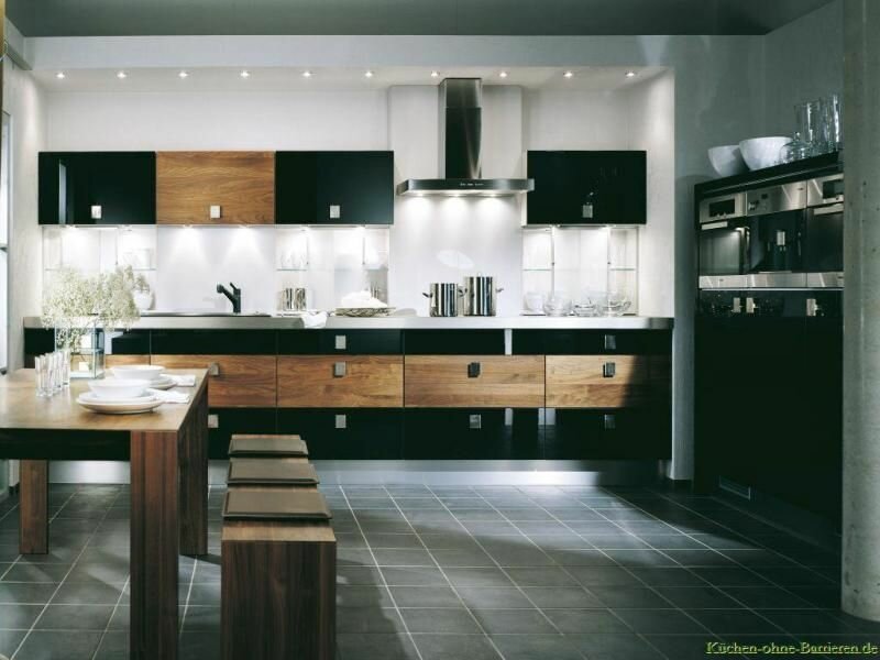 Немецкие кухни характеризуются тем, что используют современные варианты старых образцов кухонь. Так называемый "баварский уют" обеспечивается фасадами из искусственного состаренного дерева, оловянных решеток с матовыми стеклышками в верхних шкафах и т.д. В качестве декоративных украшений используют, например, расписные тарелки на стенах.