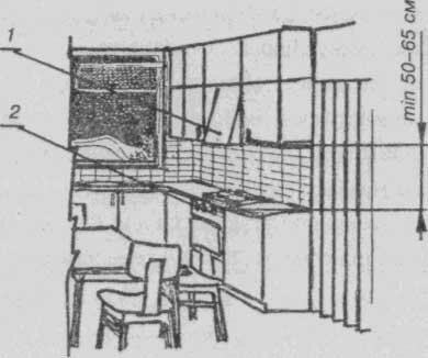 Рис. 1. Расположение вытяжки по отношению к плите: 1 - вытяжка; 2 - плита